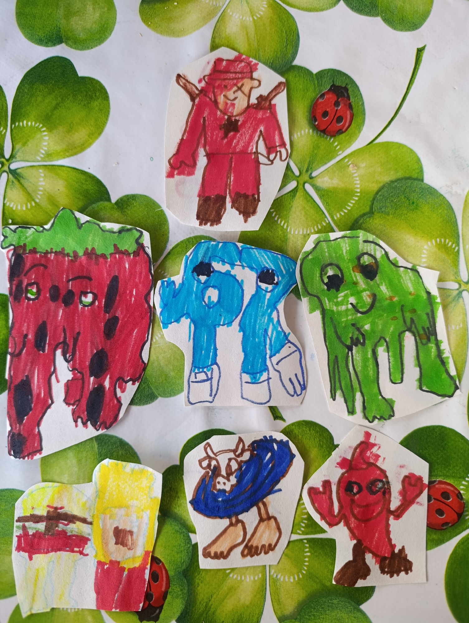 seven paper cut-outs arranged on a surface decorated with a green clover pattern. The cut-outs appear to be childlike drawings of various characters and objects, colored with markers. Starting from the top left and moving clockwise: a strawberry-shaped figure with green leaves and black seeds, a blue figure, a green blob-like character with facial features, a red bird-like figure, a character with a blue cape and brown legs, a red and yellow structure, and a red-clad figure with brown boots and a hat. Three ladybug figurines are interspersed among the paper cut-outs. The setting is indoors and the items appear to be placed on a table or similar flat surface. There is no information relating to the location in the city of Shiroko pole, Bulgaria.