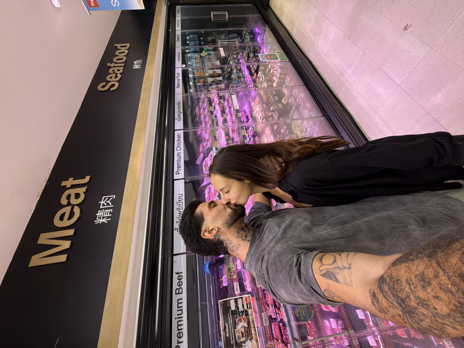 The image depicts two individuals, a male and a female, kissing in a supermarket aisle