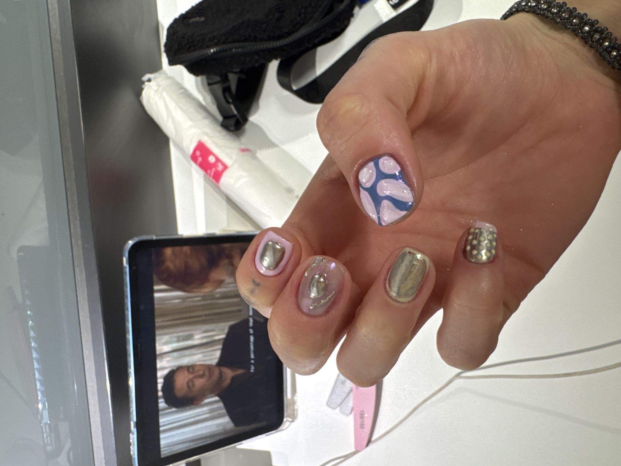 A close-up shot showcases a hand with various nail art designs. The thumb has a blue base with light pink rounded shapes. The index finger is adorned with a silver and gold glitter design. The middle finger has a clear base with a silver accent. The ring finger is painted gold. The little finger has a pink base with a gold top. The hand wears a bracelet made of silver beads. Adjacent to the hand, a mobile phone displays a man in a black shirt. A black bag and a wrapped item with pink writing are also visible. A pink nail file rests on the white surface. The location is unknown and cannot be determined based solely on the provided image. There is no indication of Hull, United Kingdom.