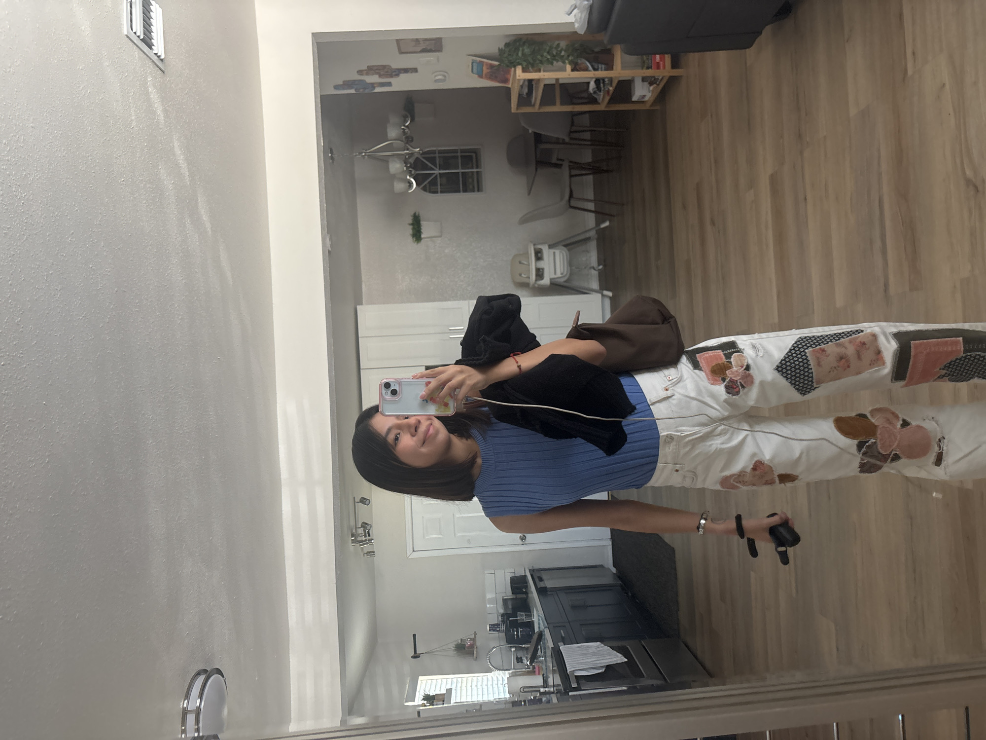 An interior mirror selfie captures a young adult female within a residential property in San Antonio, United States of America. The female subject stands center, facing a mirror, holding a light-colored smartphone in her right hand, capturing her reflection. She wears a ribbed, light blue sleeveless top and white pants adorned with multiple fabric patchwork designs. A black garment is draped over her right forearm, and a brown shoulder bag hangs over her left side. In her left hand, she holds a pair of black wireless earbuds. Her short, dark hair is styled in a bob. She displays a slight smile and wears a silver-toned bracelet and black elastic bands on her left wrist, and a red string bracelet on her right. The background, a reflection of the room, reveals an open-concept living space with light-colored wooden laminate flooring and white textured ceilings. To the left, a kitchen area features dark lower cabinets, white upper cabinets, stainless steel appliances including a refrigerator, stove, and dishwasher, and a white subway tile backsplash. A window with blinds is visible above the sink. In the mid-ground, a dining area contains a dark rectangular table surrounded by four light-colored chairs, illuminated by a silver-toned chandelier. A white high chair is positioned nearby. Wall decor includes an arched window frame, two white wall-mounted planters with green foliage, and wooden cactus art. To the far right, a partial view of a dark-colored sofa and a wooden shelving unit with various items, including a plant, are visible, indicating a living room section. The walls are predominantly light-colored.