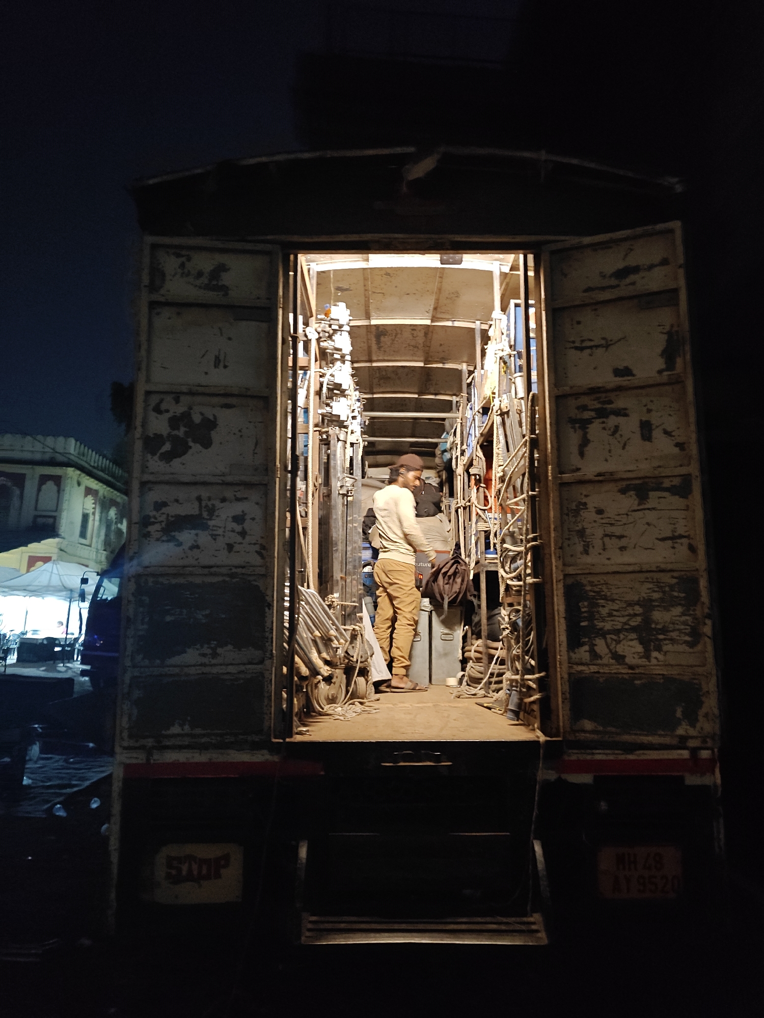 open back of a truck filled with equipment, likely for a film or event production. A man wearing a light-colored shirt and khaki pants is inside the truck, appearing to be organizing or securing the equipment. The truck's license plate is visible, reading "MH 48 AY 9520". The "MH 48" code indicates that the truck is registered in the Kolhapur region of Maharashtra, India. Outside the truck, there is an outdoor area with some lights, tents, a building, and vehicles, indicating it is likely a public area. The presence of production equipment and people suggests an event or filming is in progress, with the truck serving as a mobile storage or support unit.