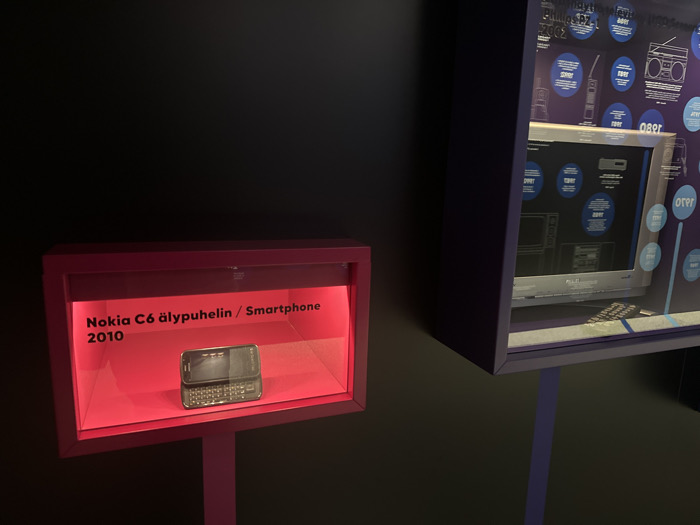 This image depicts a technology exhibition in a dimly lit museum setting in Lahti, Finland