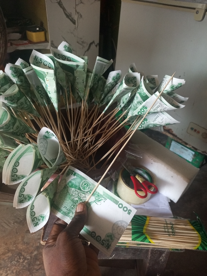 Indoors, location unknown in the city of Unknown, Unknown. The scene centers on a large, dense arrangement of numerous Nigerian 500 Naira banknotes. Each banknote is folded into a conical shape and secured to a slender wooden skewer. These skewers are clustered together, forming a prominent, bouquet-like structure. In the lower right foreground, a dark-skinned hand holds one of these skewers with an attached 500 Naira note, indicating the process of assembly or presentation. Adjacent to this main arrangement, on a flat surface, are crafting materials including a roll of beige adhesive tape, red-handled scissors, a package of unused wooden skewers, and a rectangular white foam block. The background is blurred, showing parts of an indoor wall and a dark vertical element.