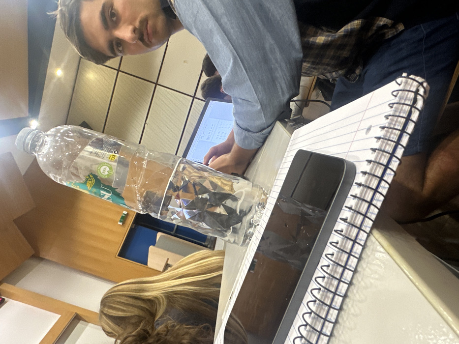 The image depicts an indoor scene within a classroom or lecture hall located in Oeiras, Portugal. In the foreground, a white spiral-bound notebook with ruled pages lies on a light-colored desk. A black rectangular electronic device, consistent with a smartphone, rests face down on the notebook. Immediately behind these items, a clear plastic water bottle, partially filled with liquid, stands upright. The bottle label displays the brand "LISU" and a "100%" recycling icon. To the right, a male individual is seated at the desk, looking directly at the camera. He has dark hair, a mustache, and wears a light blue long-sleeved shirt over a plaid shirt. His hands are positioned over a laptop keyboard, the screen of which displays text or data. Further back and to the left, another seated individual's blonde hair is visible from behind. The background features light wood paneling on the walls, segmented white wall panels, and a recessed blue section. An emergency exit sign (green with a white figure) is visible on the wall to the far left. Overhead lighting fixtures are present on the ceiling.