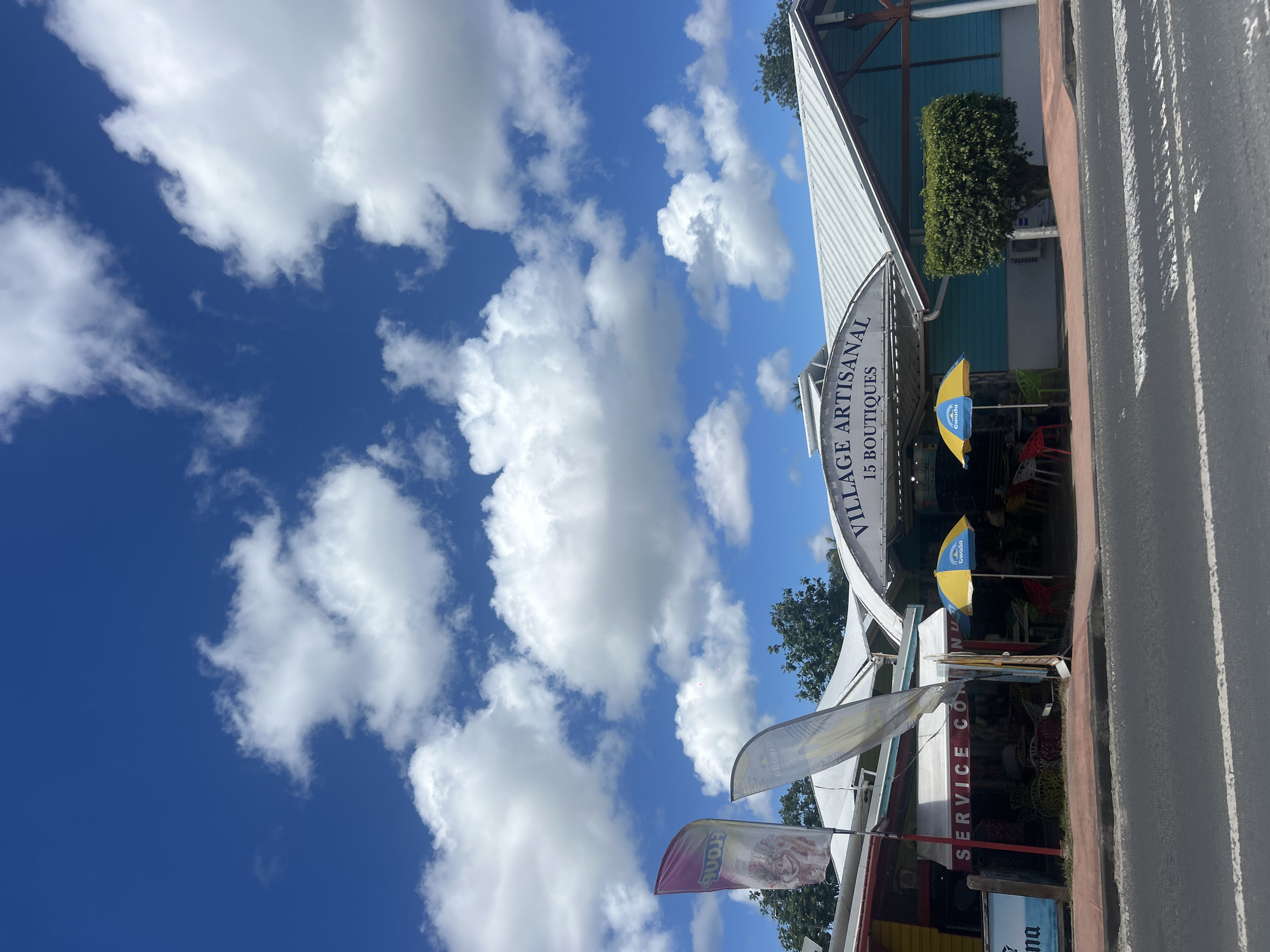 The image depicts the "Village Artisanal 15 Boutiques," a group of artisanal shops in Sainte-Anne, Guadeloupe, France. The shops are visible, with signs and flags displayed. The sky is blue and filled with puffy white clouds. The angle of the image indicates it was taken from a slightly low position. A section of road is also visible. There are some tables and chairs inside the shops. The awnings of the shops are visible. There are two yellow and blue umbrellas out front.