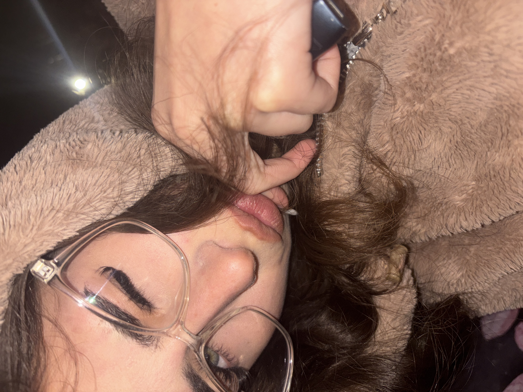A person wearing clear-framed glasses and a fuzzy, hooded jacket poses with their face close to the camera. A hand holds a small, dark object near the person's mouth, and a strand of saliva extends from their lips. The person's hair is dark and curly, and the background is dark and indistinct.