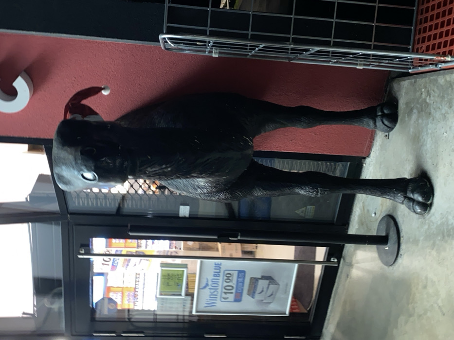 A black, life-sized reindeer statue wears a Santa hat indoors. The statue stands near a window displaying cigarette advertisements. The reindeer is positioned sideways. Metal shelving sits above the statue. The setting appears to be a retail or commercial space.