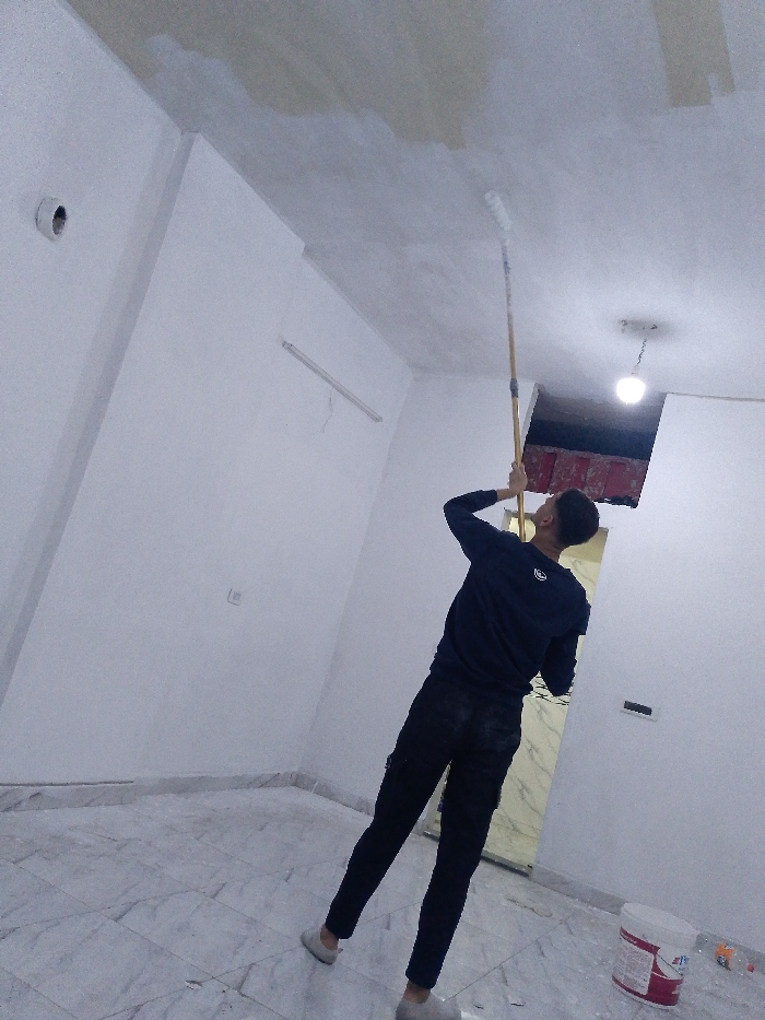 An indoor scene in Ma'raba, Syria, depicts a room undergoing painting. A male individual, viewed from behind, stands centrally, utilizing a long-handled roller to apply white paint to the ceiling. He wears a dark blue long-sleeved shirt, dark trousers, and light-colored shoes. The ceiling shows a contrast between newly applied white paint and a lighter grey/beige base. The walls are predominantly white, featuring a circular opening for a light fixture, a horizontal fluorescent tube light fixture, and a rectangular electrical outlet. The floor is covered with light-toned, marble-patterned tiles. In the background, a bare incandescent bulb hangs from the ceiling near a large rectangular opening that reveals a gold-toned, possibly marble-patterned surface to its right and a reddish area deeper within. A white and red paint bucket rests on the tiled floor in the lower right foreground.