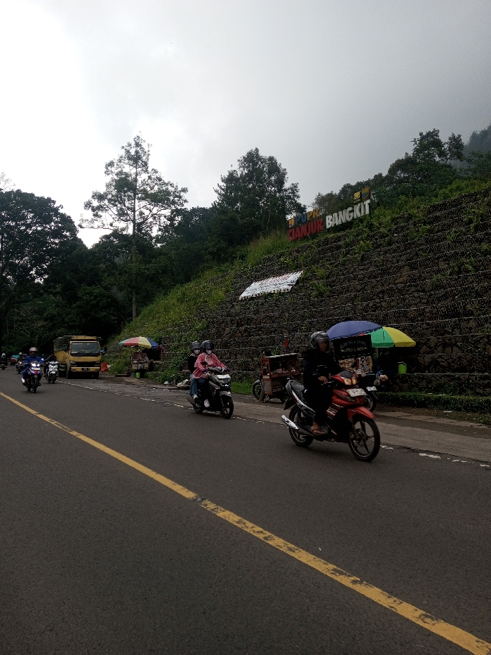 The image depicts a roadside scene on an overcast day. A dark asphalt road with a solid yellow line on its left edge dominates the foreground and mid-ground. Vehicles are traveling away from the viewer on this road. To the right of the road is a dirt and gravel shoulder, bordered by a steep, terraced hillside. This hillside is reinforced with wire mesh gabions filled with rocks and covered in green vegetation, including grass and scattered trees. Prominently displayed on the upper section of the hillside are large, three-dimensional letters spelling "CIANJUR BANGKIT," rendered in white, blue, and yellow. Below this sign, a white banner with red text is attached to the hillside reinforcement. Dense green foliage and trees crown the hillside and extend further to the left, suggesting a heavily vegetated or forested area. The sky is uniformly light grey and overcast. Along the roadside shoulder, at least two vendor stalls are visible. One, positioned in the mid-ground right, features a multi-colored umbrella with green, yellow, blue, and red segments, shielding a counter or display. A small, brown, three-wheeled utility or vending vehicle is parked adjacent to this stall. Further left, another stall with a red and white umbrella is partially visible. Multiple motorcycles are on the road. In the immediate foreground, a person wearing a dark jacket and a light helmet rides a red and black scooter, moving forward. Slightly behind and to its left, a black scooter carries two individuals. The rider wears a dark jacket and a light helmet, while the passenger wears a pink long-sleeved top, a light helmet, and a white face mask. Further down the road, on the left side, a line of at least three more motorcycles, each with helmeted riders, is visible. Behind these motorcycles, a yellow box truck is present on the far left lane. All visible vehicles are traveling in the same direction, away from the viewer.