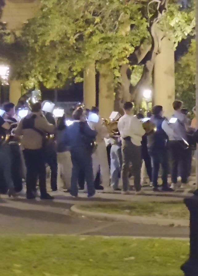 A group of musicians are playing instruments outdoors at night. They stand on a paved path beside a lawn in front of trees. The musicians are mostly facing away from the camera. Their music sheets appear to be lit by individual lamps clipped to the stands. The tree branches are dark, with lighter leaves illuminated by the streetlights. The setting appears to be a park or university campus.