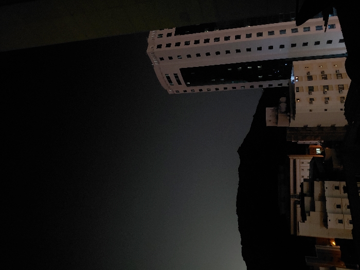 Two buildings stand against a darkening sky. One is white, with rows of square, dark windows. The other building, also white, appears taller and narrower, featuring smaller, more numerous windows and lights. Both structures are silhouetted against a backdrop of what looks like a mountain.