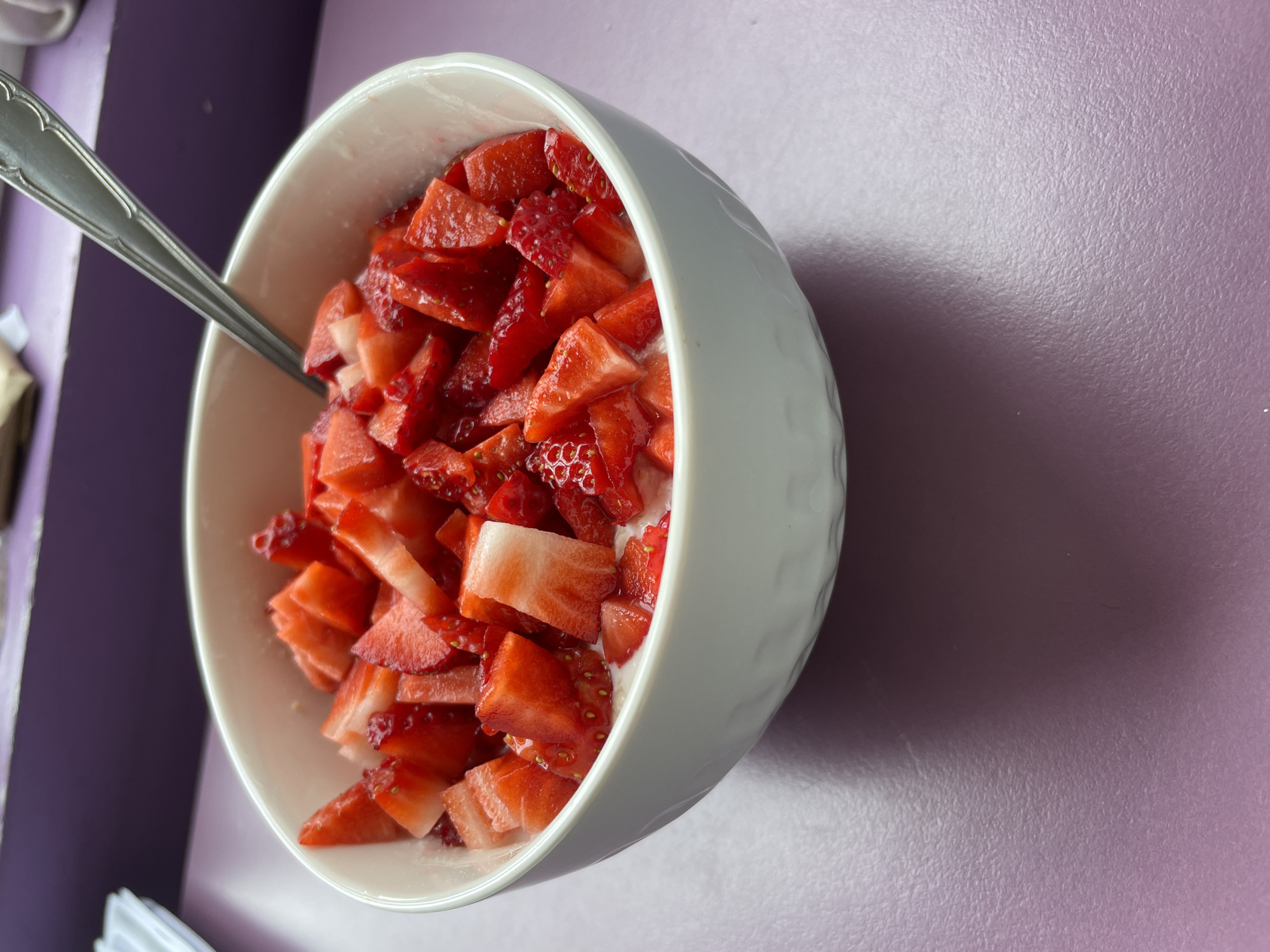 A top-down shot depicts a white bowl filled with chopped strawberries and a silvery spoon. The bowl is positioned on a surface that appears to be light purple. The location is unknown and there is no indication of the image being located in Pazardzhik, Bulgaria.