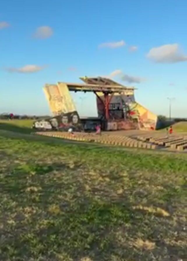 graffiti-covered, angular open-air stage with concrete block seating on a grassy area under a partly cloudy blue sky