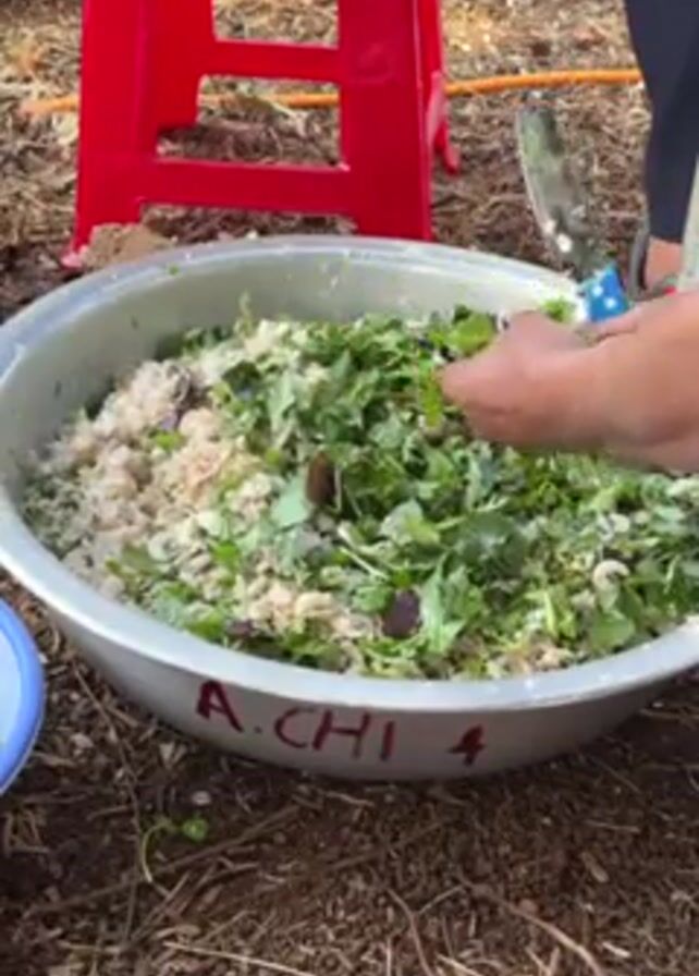 A person is chopping fresh green herbs into a large aluminum bowl filled with rice and other ingredients. The bowl is resting on a bed of mulch on the ground. The bowl is labeled "A.CHI 4". A red plastic stool is located behind the bowl. A smaller blue bowl is seen to the left of the large bowl. The person uses a small, blue-handled knife to chop the herbs.