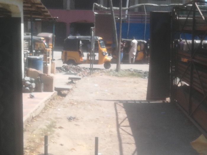 The image displays a daytime outdoor scene on an unpaved street or market area in Zaria, Nigeria, under bright sunlight. In the left foreground, a dark vertical structure partially obstructs the view of a corrugated metal shelter. Beneath this shelter are a blue barrel, a pile of grey, rounded objects (possibly stones), and a smaller dark container. A small dark bird is perched on a low concrete curb that runs parallel to the foreground. The midground features an unpaved road littered with debris on its left side. Multiple yellow and black motorized tricycles, commonly known as Keke Napep, are positioned along the road; at least three are clearly visible. Several individuals are present in proximity to the tricycles. One person stands prominently near the center-right, clad in a long, white traditional garment. Another individual wears a light blue shirt. In the right foreground, a dark vertical rectangular panel, likely part of a gate or wall, stands alongside a reddish-brown metallic structure, possibly the side of a truck or another gate. Distinct shadows from overhead structures are cast across the dirt ground. The background reveals blurred buildings with light and reddish-brown facades, and a large blue vehicle, possibly a truck, is partially visible.