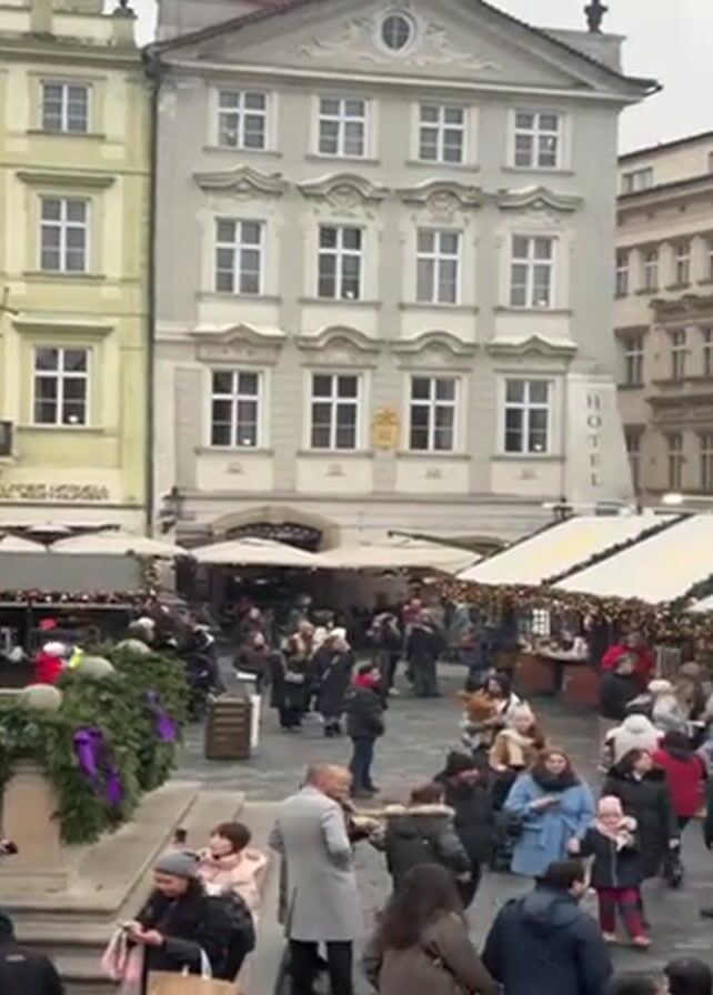 bustling Christmas market scene in a European square. Numerous people, mostly dressed in winter clothing, are seen walking around, browsing stalls with white-and-gold striped awnings. The stalls are decorated with Christmas greenery and ornaments. In the foreground, there is a large stone monument adorned with wreaths. The square is surrounded by buildings with ornate facades. One building has a sign reading "HOTEL". The overall atmosphere suggests a festive holiday gathering. The weather appears to be overcast.