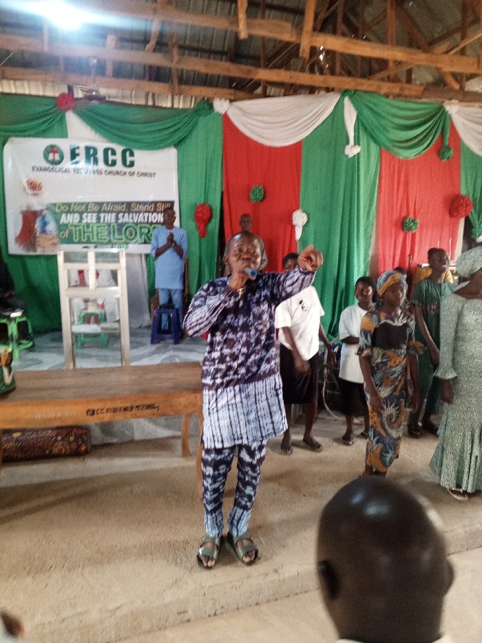 A male individual with dark skin, wearing a patterned blue and white long-sleeved tunic and matching trousers with green sandals, stands centrally in an indoor setting. He holds a microphone to his mouth with his left hand while extending his right arm forward with a closed fist. Behind him, a backdrop features green, white, and red draped fabric. A white banner displaying "ERCC Evangelical Reformed Church of Christ" and the text "Do Not Be Afraid, Stand Still AND SEE THE SALVATION OF THE LORD" (Exodus 14:13) is visible. A white wooden stand or pulpit is positioned to the left of the central figure. Another male individual in a light blue traditional outfit stands behind the pulpit with clasped hands. Several other individuals, men and women, are visible in the mid-ground and background, observing. A wooden bench is in the lower left foreground. The ceiling structure reveals wooden beams. The location is an unidentified facility in Unknown, Unknown. A bald head of an individual is partially visible in the extreme foreground, suggesting an observer directly in front of the camera.