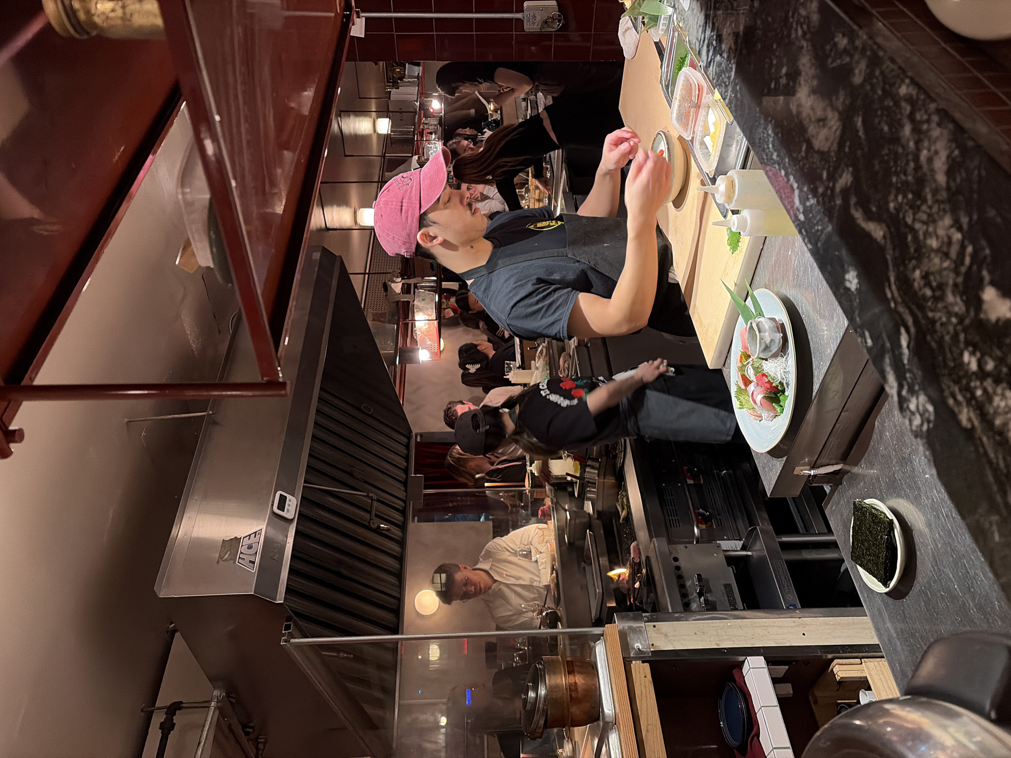 This is an interior view of Kamehameha Snack Bar, located on St-Laurent Boulevard in Montreal, Quebec, Canada. The image captures a dynamic scene within the restaurant's open kitchen and dining area. In the midground, a male chef wearing a pink baseball cap, a black t-shirt, and a dark apron is centered, preparing food at a wooden cutting board set on a counter. He has a mustache and a visible neck tattoo, and his hands are busy placing small, reddish ingredients into a white bowl. To his left, on a light blue plate, a meticulously arranged platter of sushi or sashimi with various fish and garnishes is displayed. Adjacent to the wooden board, several clear containers hold ingredients such as roe and chopped greens, alongside two white squeeze bottles. Behind a clear protective barrier to the left, another chef, wearing a black t-shirt with a rose design and an apron, is operating a commercial grill or stovetop, where flames are visible, indicating active cooking. Further back behind this barrier, a male patron in a white collared shirt and glasses is seated at a counter, with two wine glasses positioned in front of him. The background reveals more of the restaurant's ambiance, including dark red tiled walls on the right side, overhead reddish-brown shelving units, and warm lighting from recessed fixtures and circular wall sconces. Multiple other customers are visible seated at tables and counters, dining and interacting. Stainless steel commercial kitchen equipment, including large range hoods, one bearing an "HCE" logo, are prominent features of the open kitchen. In the immediate foreground to the left, a small white oval dish holds several sheets of nori, resting on a dark, mottled counter surface.