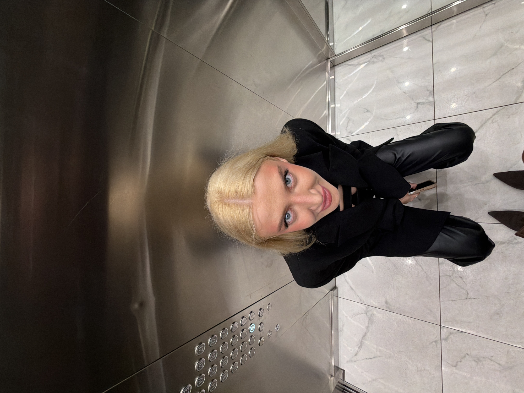 An overhead view shows a woman with blonde hair and blue eyes in an elevator in Belgrade, Serbia. She's wearing a black jacket and black leather pants and is holding a phone. The elevator interior is stainless steel with a panel of buttons. The floor is white marble.