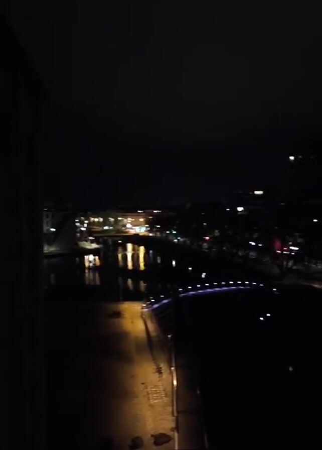 A dark, blurry nighttime view of a cityscape from an elevated position, likely a balcony