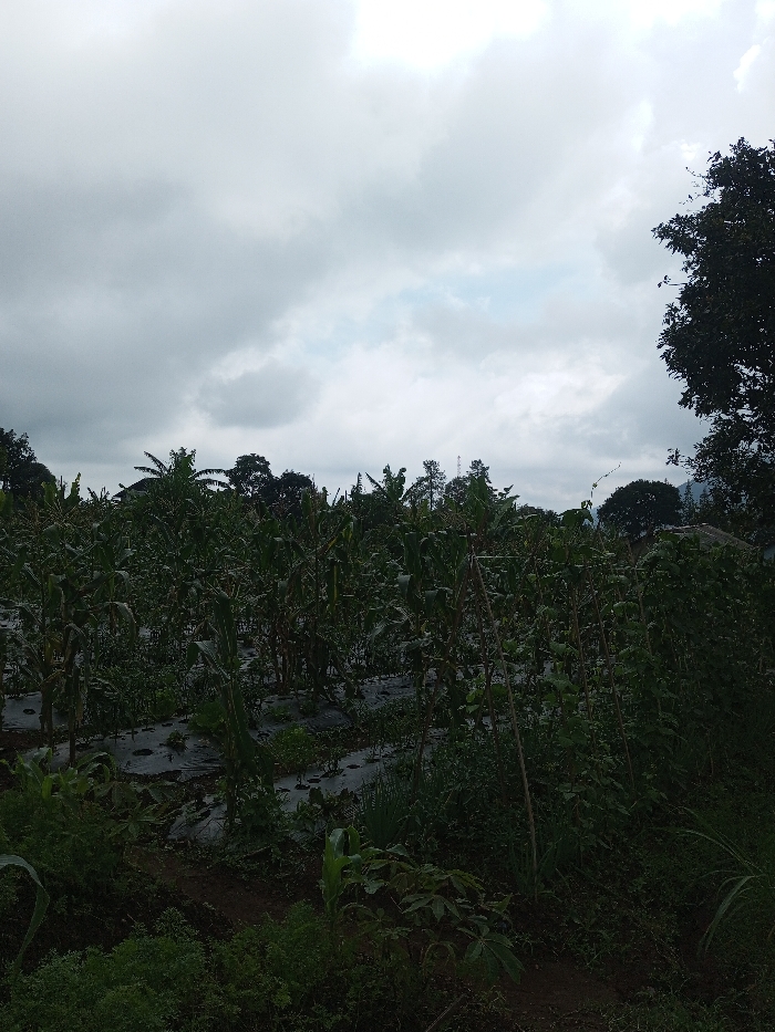 The image depicts an agricultural field in Kondha, India, under an overcast sky. Rows of crops dominate the foreground and midground, featuring mature corn stalks and pole beans supported by wooden stakes. Black plastic mulch covers the ground between some of the planted rows. Various other green leafy plants are visible throughout the field, including some smaller plants in the immediate foreground. The background consists of a dense line of trees, including banana trees and other deciduous or coniferous species, with faint outlines of what appear to be distant structures or hills partially obscured. No individuals or animals are present. The lighting is diffused, consistent with the cloudy conditions.