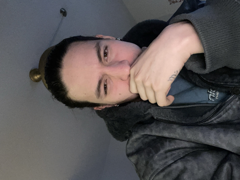 A person is captured in a close-up shot. The individual has dark hair pulled back, fair skin, and brown eyes. A hand is raised to their face, partially covering their mouth. They wear a dark-colored jacket with a fur collar, visible over a blue shirt. A tattoo is present on the hand. The background consists of a plain wall, with a portion of a light fixture visible in the upper left corner. The image is slightly rotated.