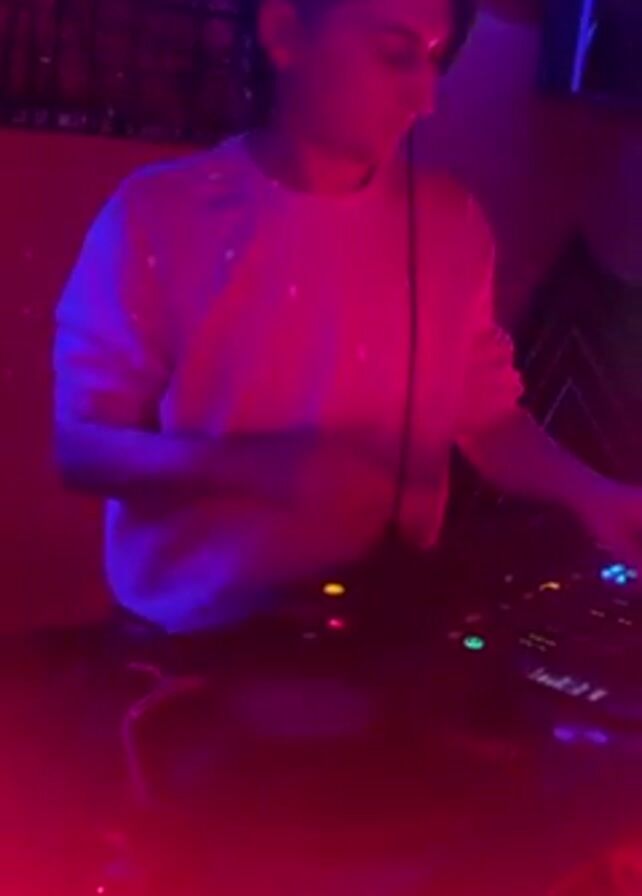 A DJ is mixing music on a DJ mixer in a dimly lit space