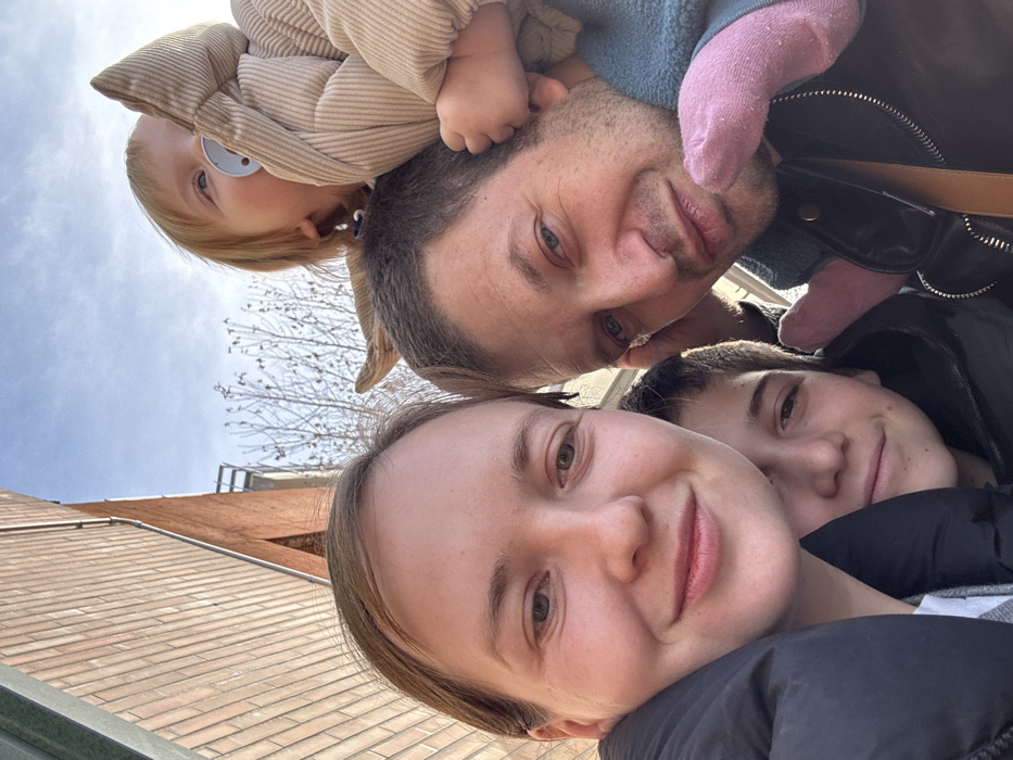A close-up, outdoor selfie-style photograph taken in Como, Italy, depicts four individuals under a clear blue daytime sky. In the foreground, an adult female with light brown hair, wearing a dark puffer jacket, smiles faintly towards the camera on the left. To her right, an adult male with short dark hair and stubble, wearing a dark jacket over a blue garment, also smiles faintly at the camera. Partially obscured between the adults is a male child with dark hair, wearing a dark puffer jacket, who is also smiling towards the camera. A toddler with light reddish-blonde hair, wearing a beige corduroy puffer jacket, is positioned on the adult male's shoulders. This toddler has a blue pacifier in its mouth, one hand with a pink mitten is visible, and it faces away from the camera, looking upwards. The background features a brick building on the far left, bare tree branches against the sky, and a reddish-brown building partially visible further back.