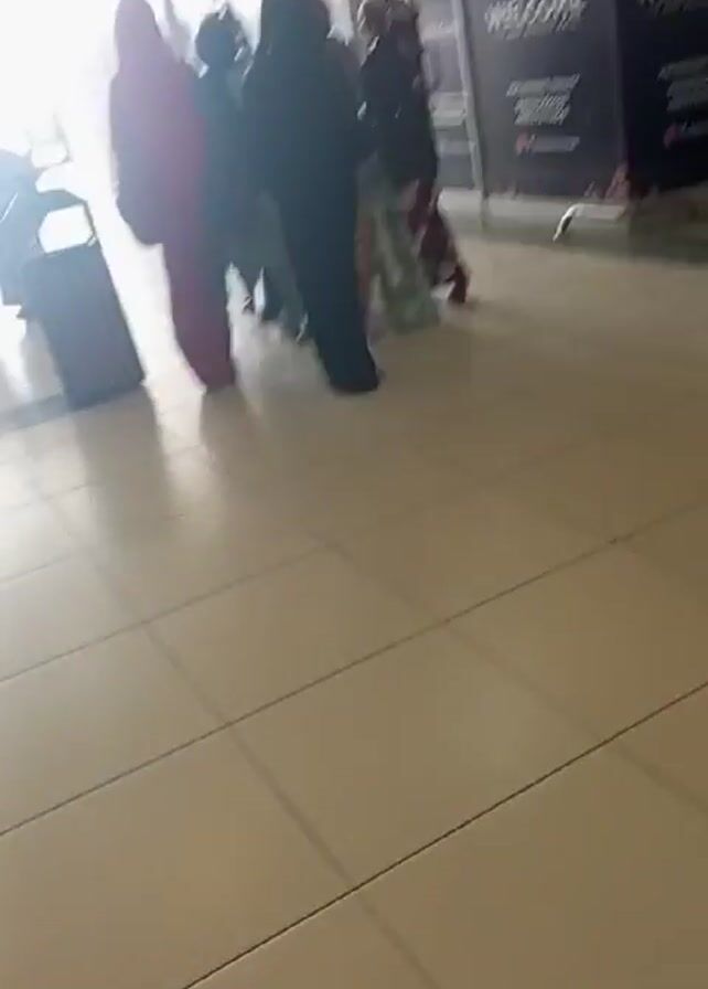 group of four women, most wearing clothing associated with Islamic dress, walking in a tiled corridor toward a set of glass doors. One woman wears a red robe-like garment, another is in black, and others in lighter colors. One woman has a patterned dress visible. There is a striped suitcase on wheels beside them. The corridor has large glass windows or doors on one side, with “Welcome” signage visible. A trash receptacle is present on the left. The camera is unsteady.