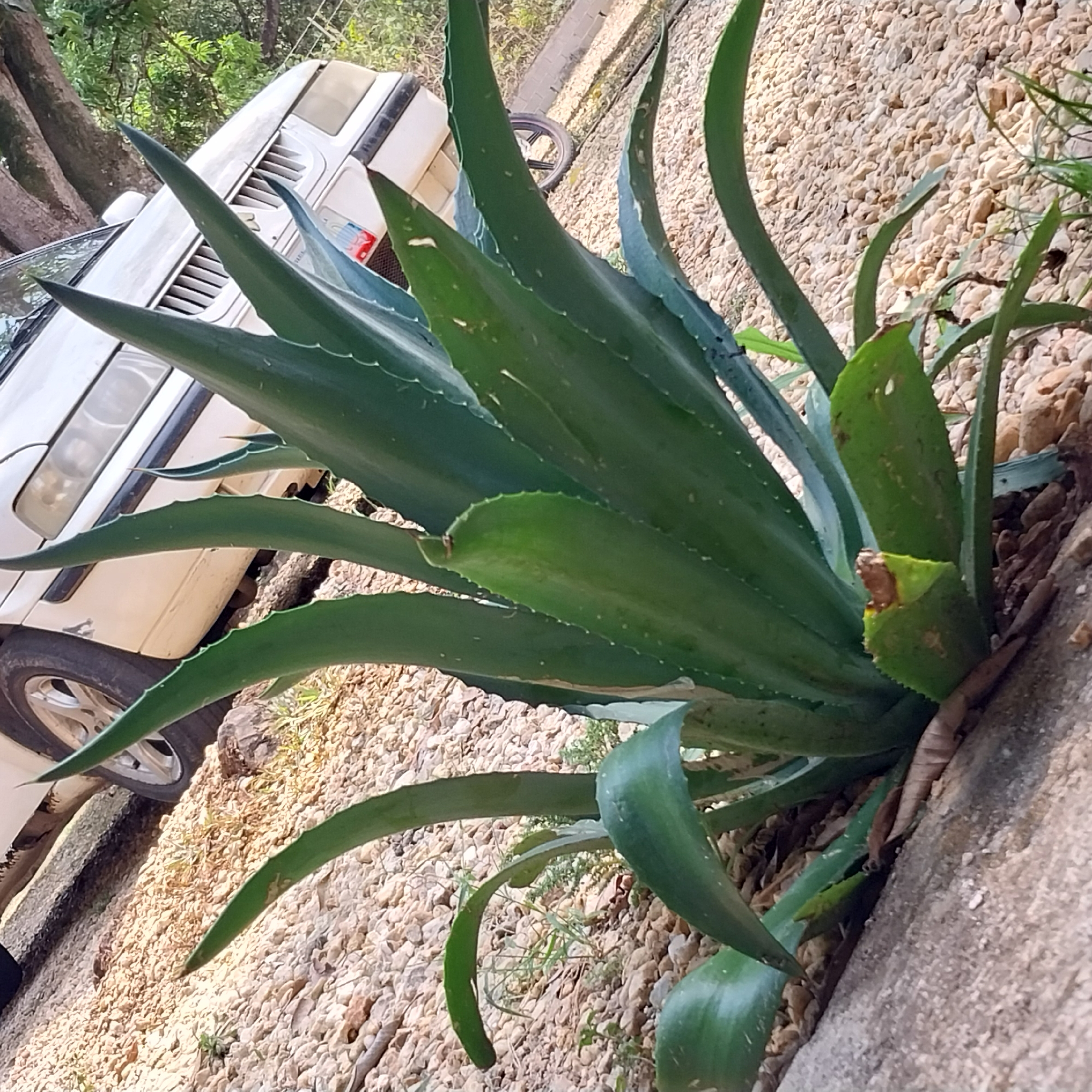 large, green agave plant growing next to a concrete edge in an area covered with small, light-colored gravel. A white car is parked nearby. The location is Tinaquillo, Venezuela.