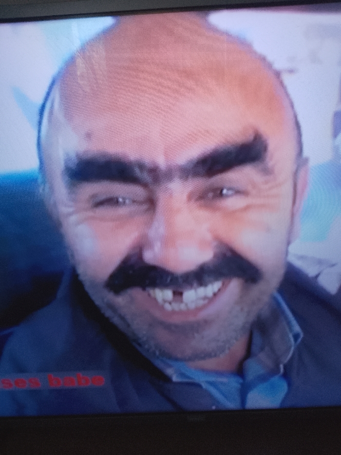 The image displays a headshot of an adult male captured from a screen, indicated by visible scan lines and pixelation. The subject is bald, with prominent, dark, thick eyebrows that appear nearly conjoined, and a dark, thick mustache. He is smiling broadly, revealing a gap where his upper left central incisor is missing. Wrinkles are visible around his eyes, which are directed forward. He wears what appears to be a dark outer garment over a lighter blue collared shirt. The background is out of focus, consisting of blue and light tones, suggesting an indoor setting. Red text, "ses babe," is present in the lower-left quadrant of the screen display. This scene is situated in Levice, Slovakia.