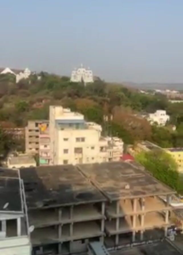 panoramic view of a cityscape under a bright, clear sky. In the foreground are buildings, some appearing to be unfinished construction, with concrete rooftops. As the camera pans, more buildings come into view, a mix of residential and commercial structures with various roof styles. Scattered trees and greenery are interspersed between the buildings. In the distance, a hill is visible, crowned by what appears to be a white religious building with multiple domes. A light haze hangs in the air, softening the distant landscape.