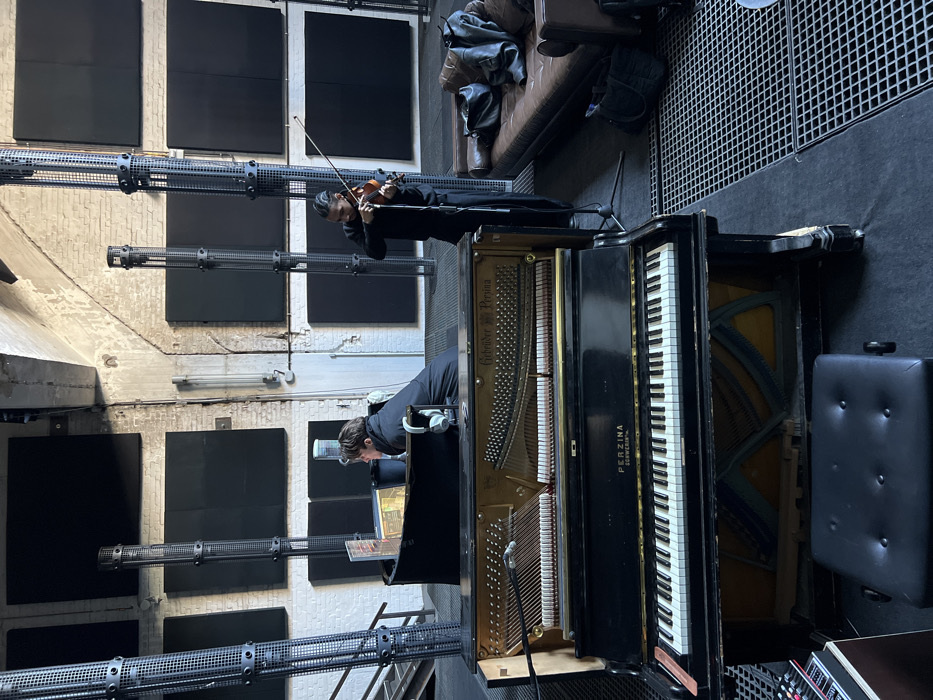 The image depicts an indoor scene within a large, industrial-style building, consistent with a repurposed factory or warehouse, likely serving as a recording studio or performance space in Berlin, Germany. The environment features exposed white brick walls, a high ceiling, and multiple large, black acoustic panels mounted on the walls. The floor consists of black sound-absorbing material and metal grates. Several tall, black, cylindrical, perforated metal structures are vertically arranged throughout the space. In the foreground, a black "Gebrueder Perzina Schwerin" upright piano, with its front panel removed to expose the strings and hammers, is positioned centrally. A black piano bench rests in front of it. To the left, a person with short, dark hair and wearing a dark jacket is seated at a black, curved control desk, which houses a monitor screen and other equipment. White headphones are visible hanging from the desk. To the right, a second person with dark braided hair, dressed in a dark long-sleeved shirt and pants, stands and plays a violin. They hold the violin to their left shoulder and a bow in their right hand. A microphone stand is positioned directly in front of them. A brown leather couch with a dark jacket draped over it is visible on the right side of the frame, with bags on the floor nearby. The scene captures two individuals engaged in a music-related activity, with one playing an instrument and the other operating a control station.