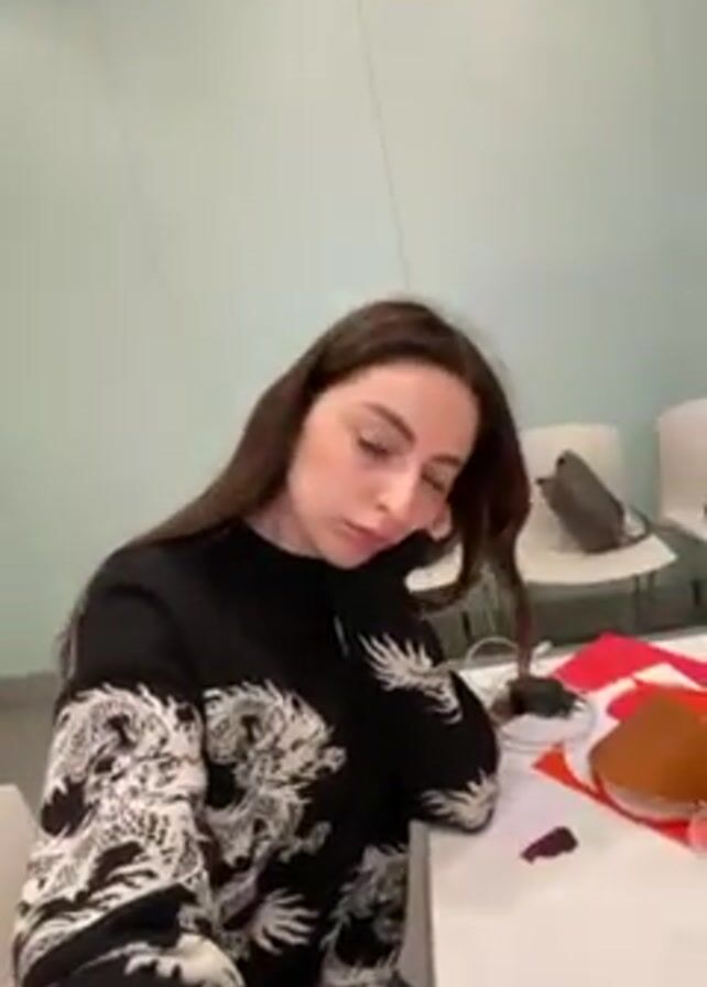 A woman with long brown hair is sitting at a table. She is wearing a black sweater with white dragon designs. She looks at the camera, adjusts her hair, and then rotates the camera to show a room with several other people sitting at tables working on art projects. A projector screen is visible in the background displaying an image. The walls of the room are a light blue-green color. There is a white air vent in the ceiling.