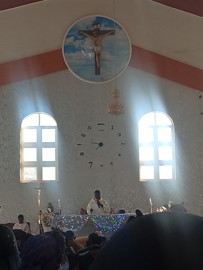 Inside a church, a priest in white robes stands at the altar, seemingly addressing the congregation. People are seated, some kneeling, their heads bowed. Above the altar, a large clock hangs on the wall between two arched windows. A circular image of Jesus on the cross is mounted on the ceiling, above the clock. A chandelier hangs nearby. Sunlight streams through the windows, illuminating the interior.