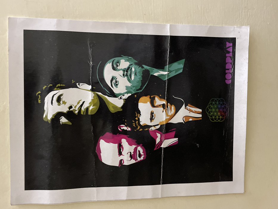 poster for the band Coldplay. The poster is printed on white paper and depicts four band members in a stylized, black and white image, with their faces colored in various hues. The image is set against a black background, with the band's name and a colorful circular symbol printed in white. The poster is folded and displayed on a white wall. The poster is located in a residence in Jaipur, India, at the coordinates latitude: 26.863, longitude: 75.821.