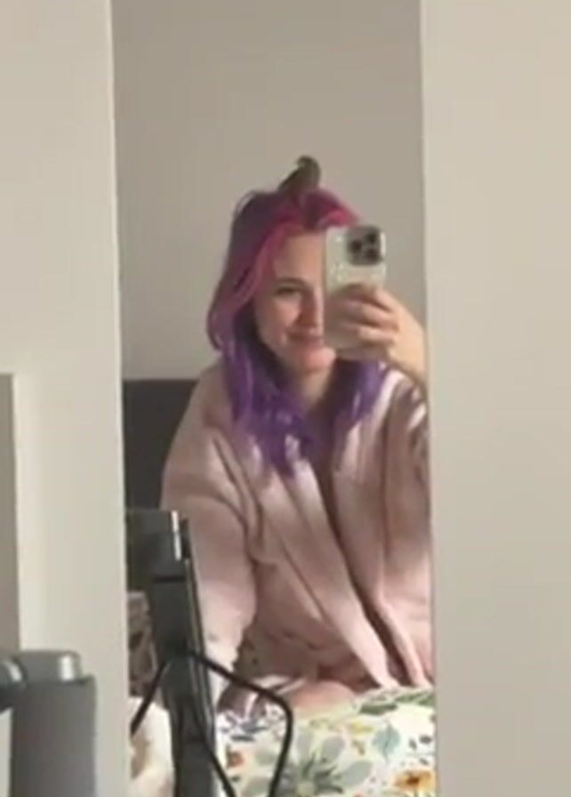 A woman with pink and purple hair wearing a pink robe is sitting on a bed, taking a selfie in front of a mirror