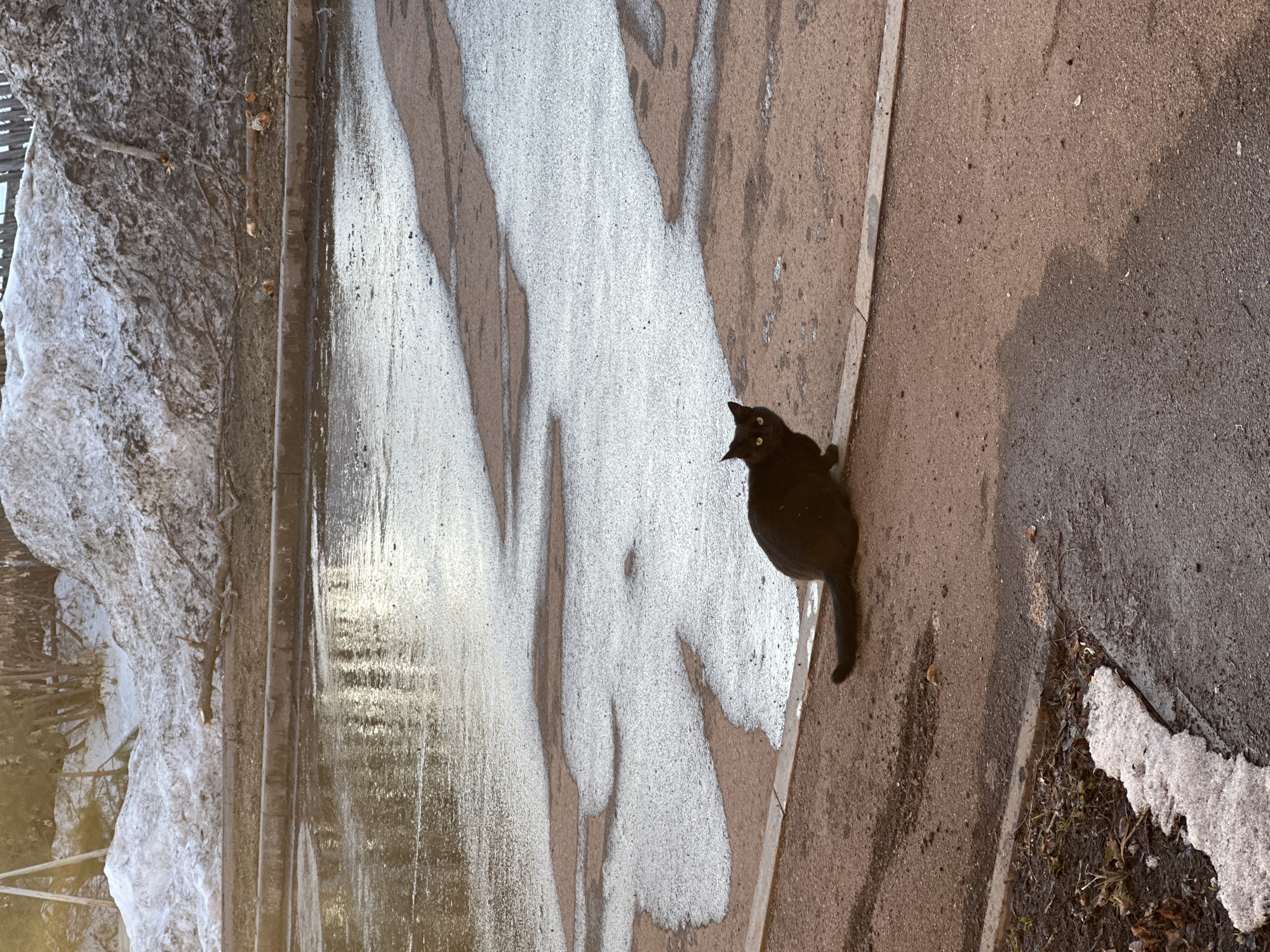 A black cat sits on a concrete surface next to a pathway that has white, water-like designs on it. A pile of snow rests next to the pathway. The location is suggested to be Aktanysh, Russia.