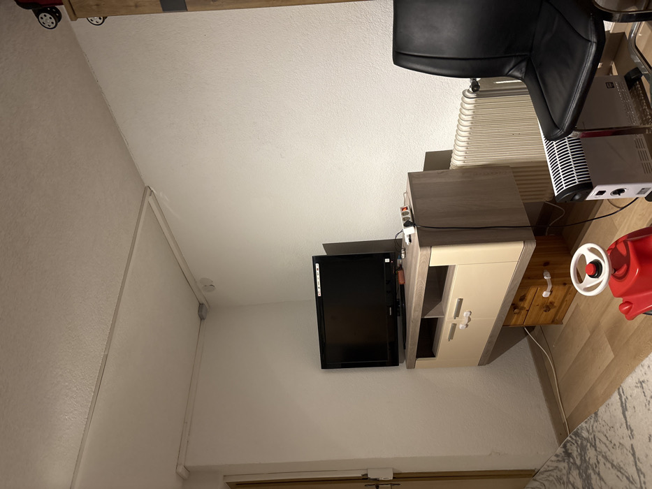 This image depicts an interior residential space within the city of Feldkirch, Austria. The scene is illuminated by artificial light. A black Toshiba flat-screen television with a dark screen rests on a two-tone wall-mounted media console. The console features a light beige body with two pull-handle drawers and an open shelf, topped by a darker wood-grain surface. A small wooden drawer unit with white handles is positioned directly beneath the console. A white multi-outlet power strip, connected to various white and black electrical cables, is situated on the console's right side. To the right of the console, a white electric space heater with a black grille and control knobs is on the light-colored wood or laminate flooring. Adjacent to it, a black chair with a faux-leather seat and backrest and a metallic base is partially visible. A white, fluted wall-mounted radiator is located behind the space heater. In the lower-center foreground, a red child's ride-on toy with a white steering wheel is present on the floor. The room has white, textured walls. White plastic conduit or cable management channels are installed along the wall-ceiling junction, connecting at a gray junction box. A rectangular white panel, possibly an access hatch, is visible on the ceiling. On the far left, a light brown door frame with a white rectangular object attached to it is partially visible. A fragment of a tall wooden cabinet or shelf is visible on the far right, with small red and black wheels atop its surface. No individuals are present in the scene, and no overt actions are occurring.