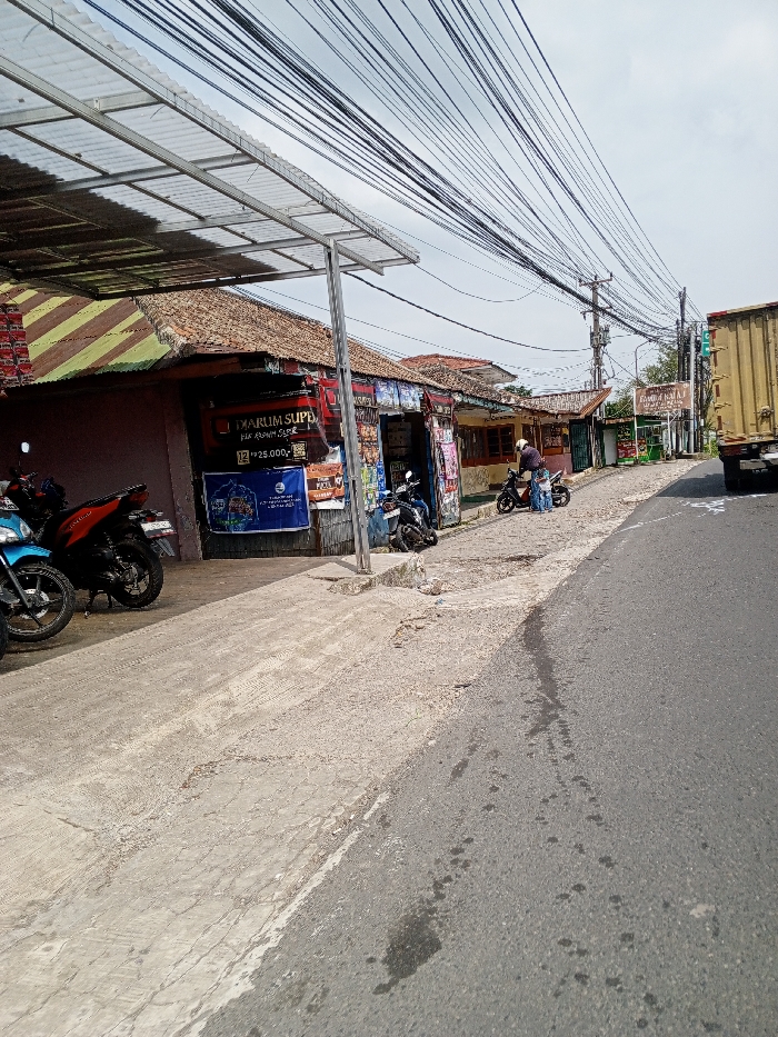 The scene captures an urban street in Multhan, India, under an overcast sky. On the left, a cracked concrete sidewalk borders a series of single-story commercial structures with weathered tiled roofs and some corrugated metal additions. A transparent corrugated canopy extends over the sidewalk from the foreground building. This building displays a large banner advertising "Djarum Super," alongside other text including "Rp 25.000,-," and various smaller posters. Several motorcycles are parked on the sidewalk; a blue one is partially visible in the immediate foreground, next to a red and black motorcycle. On the right, an asphalt road, showing minor stains and wet spots, slopes gently uphill. Mid-frame, a person wearing a light-colored helmet and dark clothing stands beside a black scooter-style motorcycle on the edge of the sidewalk, accompanied by a smaller individual. A utility pole heavily laden with numerous black electrical wires is prominent on the right side of the road. Further up the road, the rear section of a large, light brown cargo truck is visible, and greenery can be seen beyond the buildings in the background.