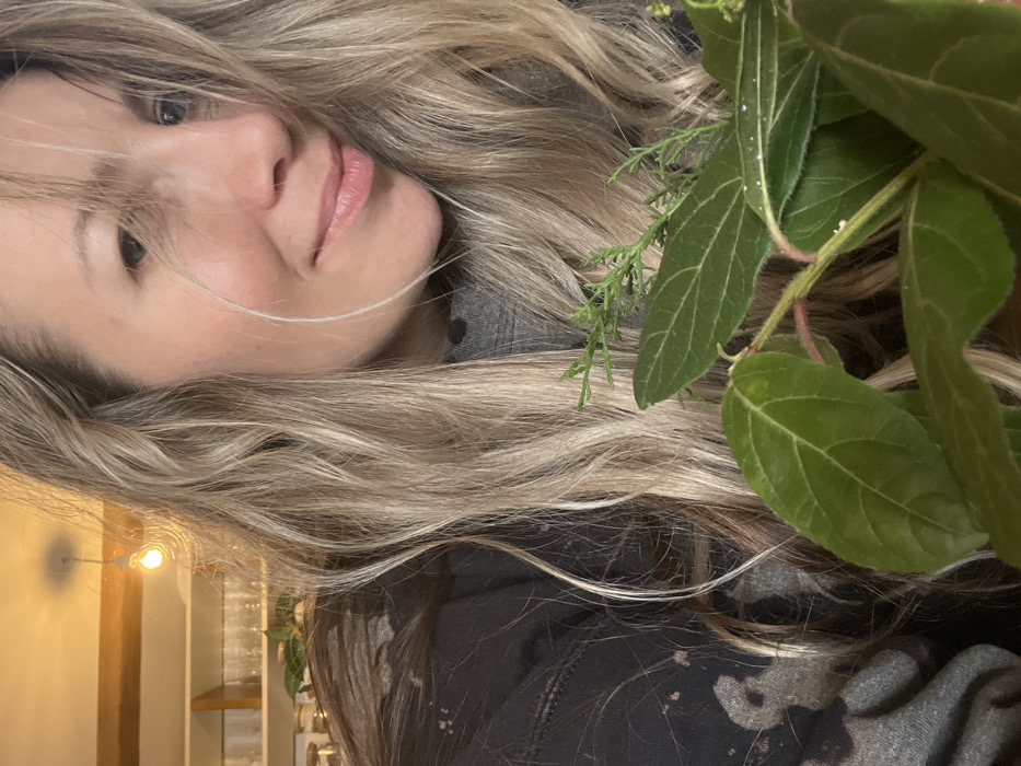 The image displays a close-up portrait of an adult female within an indoor environment, reportedly located in Pržno, Montenegro. The subject's face is partially visible, oriented slightly towards the viewer, with her right eye, nose, and mouth discernible. She has long, wavy blonde hair with varying shades, which frames her face and covers part of her left side. Her visible right eye, with a dark iris, is directed towards the camera. Her lips are closed in a subtle upward curve. She has a fair complexion with a natural pinkish tone. The subject is wearing a dark-colored, long-sleeved garment, likely a sweatshirt, featuring irregular light-toned patterns consistent with bleach application on the left shoulder and upper arm. A plain grey garment is visible beneath at the neckline. In the immediate foreground, partially obscuring the lower portion of the subject, is a dense arrangement of green plant material. This foliage consists of broad, ovate leaves with distinct venation, some exhibiting small white particulate matter on their surfaces, interspersed with finer, needle-like green sprigs. The stems of the broad-leafed plants are reddish-brown. The background depicts an interior space illuminated by warm, artificial light emanating from a visible incandescent bulb suspended from the ceiling. A horizontal wooden beam crosses the upper portion of the background. To the subject's upper left, a white shelving unit is observed, filled with numerous clear glass jars or containers.
