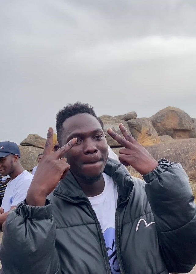 group of about fifteen African men standing in a rocky, sparsely vegetated environment. The sky is overcast. The men are wearing a variety of casual clothes, including T-shirts, jackets, jeans, and hats. The man closest to the camera flashes a V-sign before holding up two more fingers, apparently making a gesture. Most of the men appear to be interacting and talking amongst themselves. The background features large boulders and a hilly landscape.