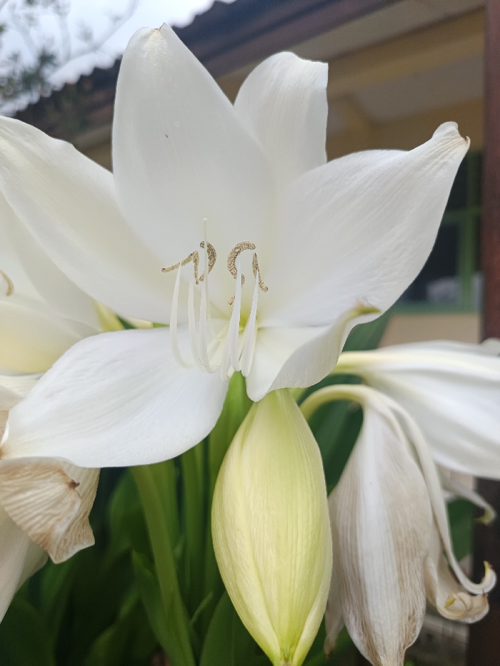 This image depicts a close-up view of a cluster of white flowers, identified as being located in Ouderkerk aan de Amstel, Netherlands. The primary subject is a large, open white flower positioned centrally, exhibiting six prominent, ovate petals with visible veining. Its reproductive organs are clearly visible, featuring multiple white filaments supporting yellowish-brown anthers dusted with pollen. To the lower right of this central bloom, a pale yellow-green, elongated flower bud, showing vertical striations, is present. On the left and right sides of the frame, partially visible white flowers appear to be in a state of wilting, with petals exhibiting browning and shriveling. Green stems and foliage are discernible beneath and between the flowers. The background is out of focus, revealing structural elements of a building: a light-colored, possibly corrugated roofline across the top, a muted yellow-beige wall below it, and a distinct dark green rectangular object, potentially a window frame or door, on the right side. A sliver of pale, overcast sky is visible above the roofline. No human subjects or discernible actions are present in the scene.