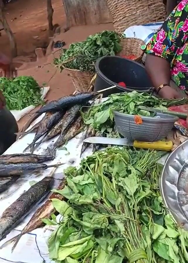 A woman is sitting behind a table at what appears to be a market stall. She is wearing a colorful floral shirt, and she is gesturing with her hands while talking. On the table are bundles of green leafy vegetables, a tray of what looks like ripe tomatoes, a large jar of pickled vegetables, several cooked fish, a knife, and a small metal strainer. There are also baskets in the background, some of which contain vegetables. In the background, another woman is visible at another stall. The environment looks like an outdoor market area with a reddish-brown dirt ground and some trees.