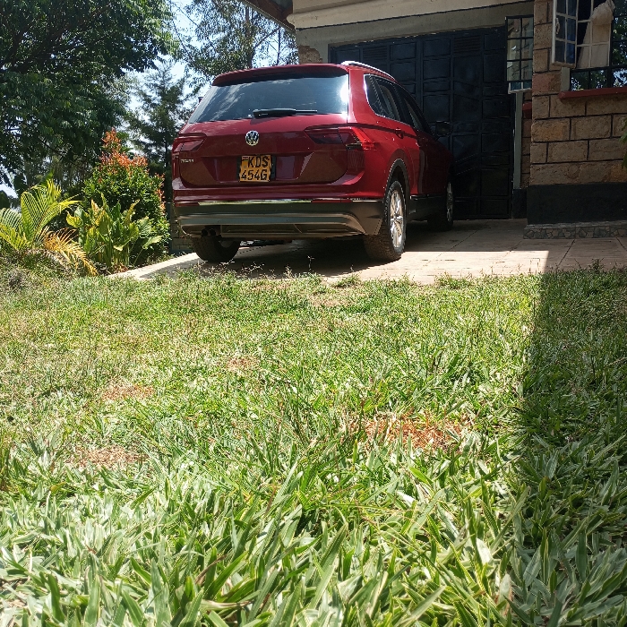 The scene depicts a red Volkswagen Tiguan SUV, license plate KDS 454G, parked on a light-colored paved driveway, partially obscuring a dark, multi-paneled garage door. The garage door is part of a building with a stone-clad exterior visible on the right, featuring a window with white frames and dark panes. To the left of the driveway, a landscaped area contains various green and reddish-leafed foliage, including a palm-like plant and shrubs. The foreground consists of a green grass lawn with some variations in growth density and color. Tall trees are visible in the background against a clear, bright sky, indicating daylight conditions. No individuals are present. This scene is located in Mahiakalo ward, Kenya.