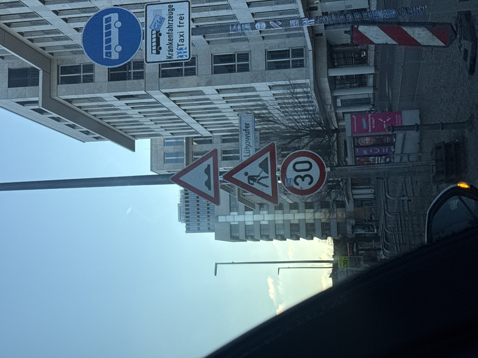 The image presents an urban street scene on Lützowufer in Berlin, Germany, captured from inside a vehicle. The foreground on the left shows the dark interior trim of a car and a partial view of an amber turn signal reflecting in the side mirror. A prominent dark utility pole stands vertically in the center-right, displaying multiple German traffic signs. From top to bottom, these include a triangular warning sign for speed bumps, followed by another triangular warning sign indicating road work (a person shoveling). Below these is a white rectangular street sign bearing the name "Lützowufer." Further down, a circular regulatory sign denotes a "30" km/h speed limit. To the right of these, higher on the pole, are a large blue circular sign with a white bus silhouette and, beneath it, a smaller blue rectangular sign with a bus silhouette and the text "Krankenfahrzeuge Taxi frei" (ambulances and taxis free). On the right side of the street, a multi-story, modern building with light-colored facades and numerous windows dominates the view. Its architecture includes horizontal banding and balconies. In the background, other multi-story buildings are visible, some with reflective surfaces. At street level, a paved sidewalk features metal bicycle racks, several dark bollards, and a public advertisement billboard with colorful posters, one of which includes "Dauerwerbung." Several bare-branched trees line the street, indicating a season without foliage. A red and white striped barrier pole stands in the lower right corner. The sky is clear and light blue, suggesting daytime. No individuals or moving vehicles are visible in the scene.