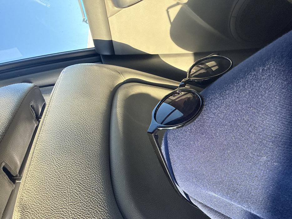 A pair of black-framed sunglasses with dark lenses rests horizontally on the upper leg of an individual, who is wearing navy blue fabric trousers. The scene is set inside a vehicle, with a light tan or beige upholstered seat back and headrest visible in the background, along with a matching door panel. Strong sunlight streams into the vehicle from the upper right, casting defined shadows on the interior surfaces. A section of clear blue sky is visible through the vehicle's window in the upper right quadrant. The specific location within Georgi-Dobrevo, Bulgaria, is not discernible from the provided image.