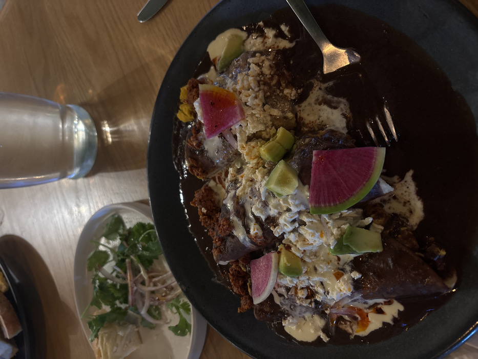 The image depicts a dining table scene in Mérida, Mexico. A large, dark gray plate in the foreground presents a meal consisting of multiple folded items, consistent with enchiladas or enmoladas, submerged in a rich, dark brown mole-like sauce. The dish is generously topped with crumbled white cheese, diced green avocado pieces, and crescent-shaped slices of pink and white watermelon radish. Further garnishes include a reddish-brown crumbly texture, small yellow florets, and dollops of white crema. A silver fork is inserted into the right side of the main dish. To the left, a smaller white plate holds a side of green herbs, thinly sliced red onions, and pieces of white bread or tortilla. A clear glass of water stands on the light-colored wooden table in the background, and the blade of a silver knife is partially visible on the far right. The setting suggests an indoor dining environment with soft lighting.