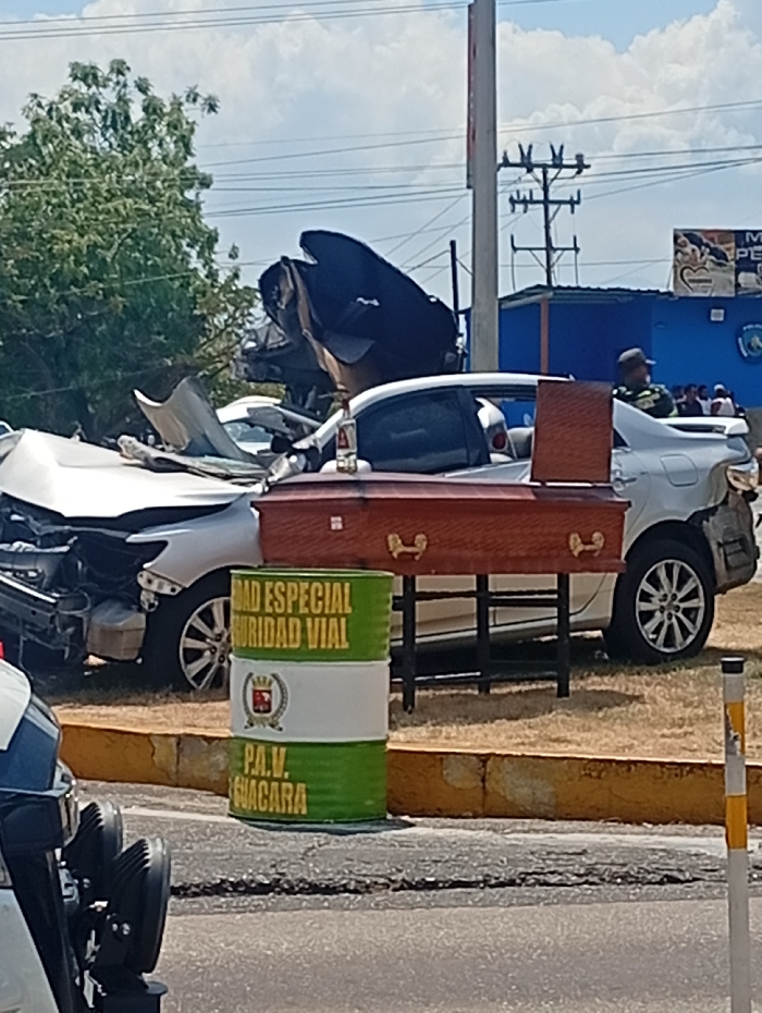 aftermath of a severe car accident. A silver vehicle is totaled with extensive front-end damage, while another silver car has damage on the rear passenger side. A brown coffin rests on a stand in front of the intact car. A green and white drum with the words "ROAD ESPECIAL SEGURIDAD VIAL" is visible. A police motorcycle and a group of people are near the accident. The scene suggests a fatal collision.