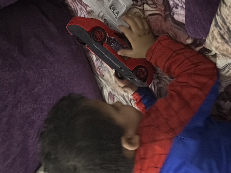 A child in a Spider-Man costume lies on a bed with a purple pillow and patterned blanket. They are holding a red toy car. The car is upside down and slightly blurred. Another toy, possibly a truck, is visible above the car. The child’s face is turned away from the camera, focusing on the toy car. Their hand is on top of the car.